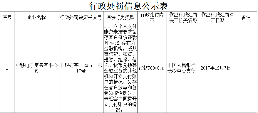 网络整理 2021-03-22 18:28中国人民银行长沙中心支行发布行政处罚信息,中移电子商务有限公司因多项违规行为被罚款5万元。违法行为包括:开立个人支付账户未按要求留存客户身份证影印件;存在为金融机构,或从事信贷、融资、理财、担保、信托、货币兑换等金融业务的其他机构开立支付账户的情况;存在客户参与和包券领取活动时,未经客户同意开立支付账户的情况。