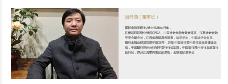 金联集团官网显示,董事长吕尚简还曾担任中国银行苏州分行金阊支行副行长等职位。