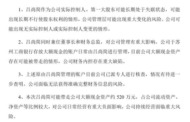 可以佐证董事长潜逃事实的是,日前新三板公司金瑞科技(股票代码:430585)公告称,其实际控制人吕尚简失联,并可能带走金瑞科技大额现金资产约520万元,目前苏州公安机关等部门已经介入。