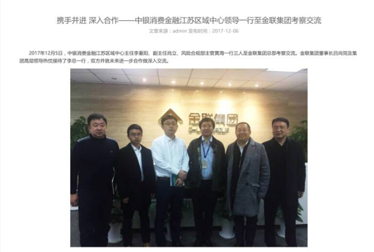 官网上最近的一条新闻,就是2017年12月5日,中银消费金融江苏区域中心主任李重阳、副主任肖立、风险合规部主管黄海一行三人至金联集团总部考察交流。