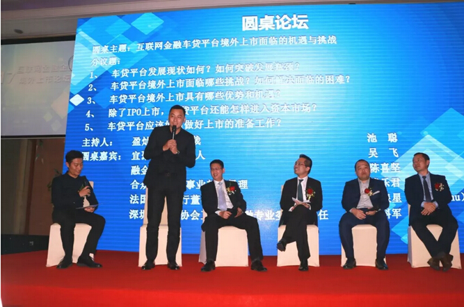 随后,在盈灿集团副总裁池聪主持的圆桌论坛中,池总联合宜聚网董事长兼创始人吴飞、融金宝CEO陈喜坚、合众e贷车贷事业部总经理熊乐君、法国巴黎银行董事朱泉星(BillyChu)、深圳市律师协会互联网金融专业委员会主任陈科军五位嘉宾就互联网金融车贷平台境外上市面临的机遇与挑战的相关问题展开了更深层次的探讨,对于互联网金融车贷平台发展现状及其进入资本市场的途径阐述了相关的看法。