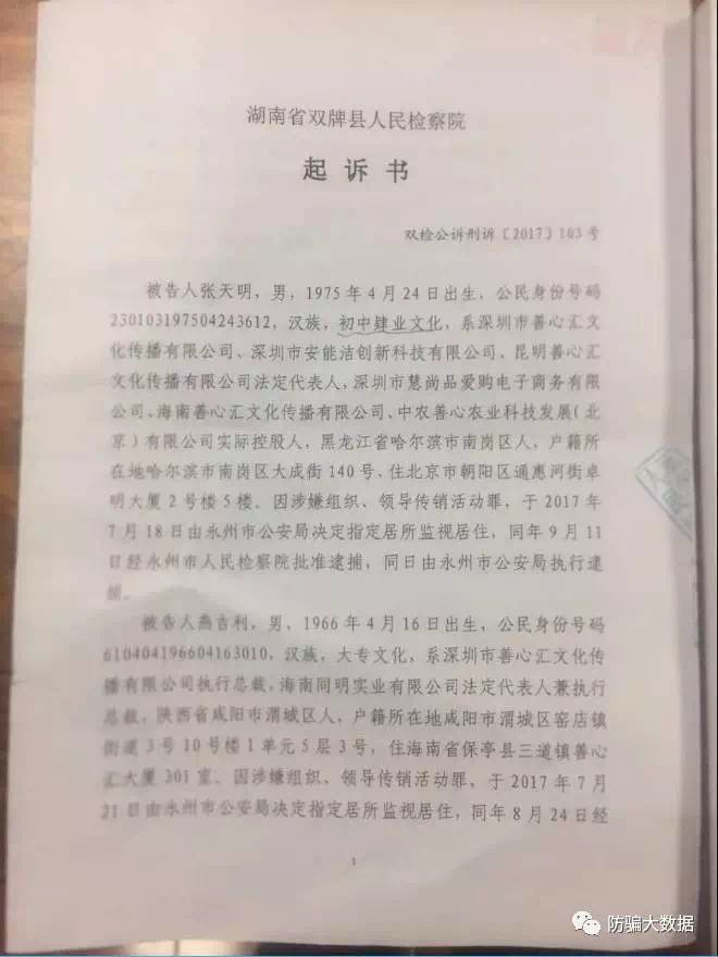 网络整理 2021-03-22 18:34据湖南经侦官方微信消息,在众多善心汇高层骨干接二连三被起诉、判刑后。近日,善心汇传销头目张天明等人已被湖南省双牌县人民检察院起诉。