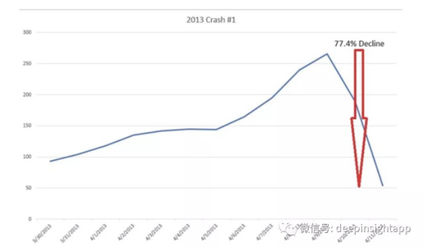 2011年开始的时候,比特币还只有0.3美元/币,到了6月8日那天触达到了31.5美元/币,在半年不到就取得了105倍的涨幅。然后不到一个月的时间内,比特币就暴跌到了11美元/币,再过了一个月不到又下跌到了7.8美元/币,然后继续回落到4.77美元/币。也就是说,在90天的时间内,比特币暴跌了85%。
