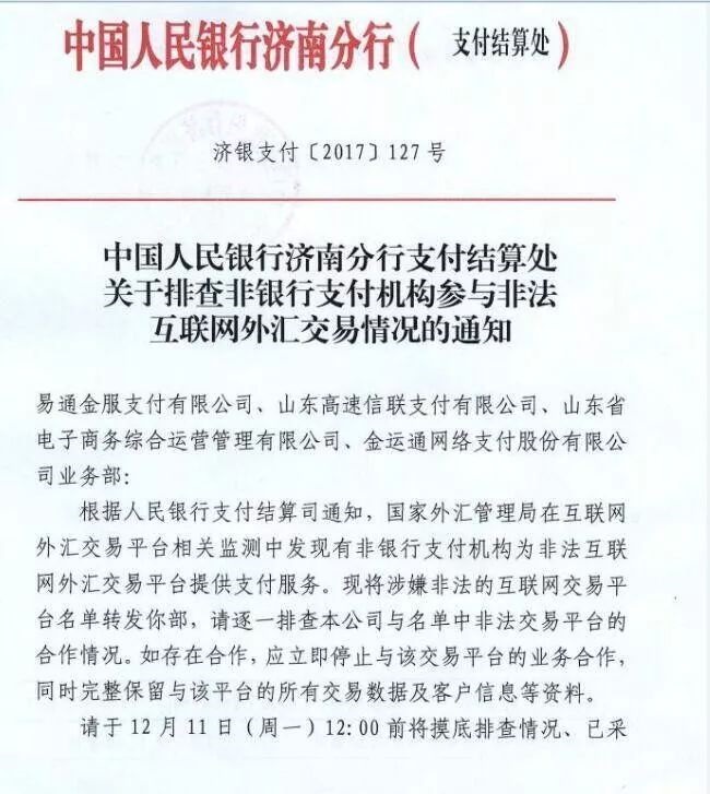 网络整理 2021-03-22 18:37近日,中国人民银行济南分行下发通知排查非银行支付机构参与非法互联网外汇交易的情况。通知称,国家外汇管理局监测发现有非银行支付机构为非法互联网外汇交易平台提供支付服务。要求各家支付机构根据公示的名单逐一排查与非法交易平台的合作情况。如存在合作,应立即停止与该交易平台的业务合作,同时完整保留与该平台的所有交易数据及客户信息等资料。