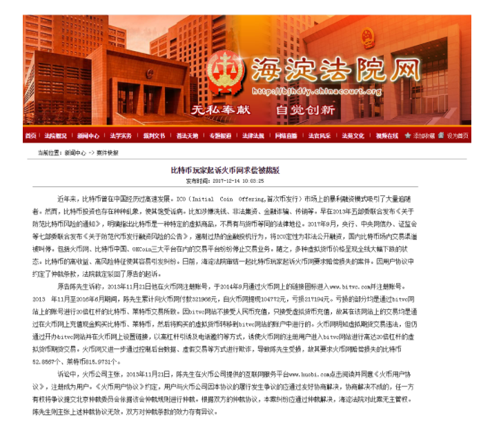 网络整理 2021-03-22 18:38据海淀法院官网消息,一位比特币玩家因亏损217194元起诉火币网要求赔偿损失,海淀法院日前受理了此案,因用户协议中约定了仲裁条款,法院最后裁定驳回原告的起诉。