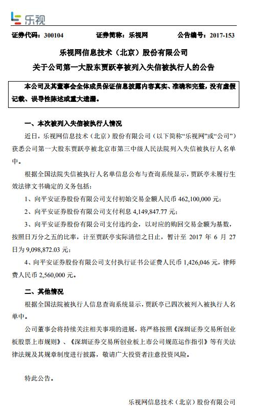 13日晚乐视网发布公告称,公司获悉公司第一大股东贾跃亭被北京市第三中级人民法院列入失信被执行人名单中。