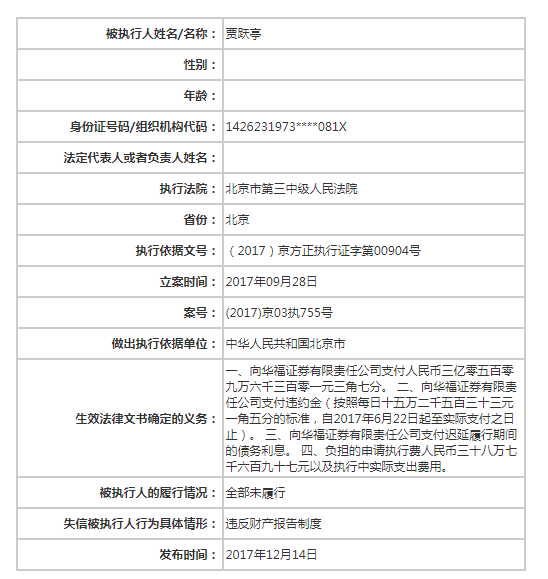 贾跃亭本次被列为“老赖”的案件涉及华福证券。贾跃亭有四条根据生效法律文书确定的义务:一,向华福证券有限责任公司支付人民币3.05亿元。二,向华福证券有限责任公司支付违约金(按照每日15.25万的标准,自2017年6月22日起至实际支付之日止)。三,向华福证券有限责任公司支付迟延履行期间的债务利息。四,负担的申请执行费人民币38.77万元以及执行中实际支出费用。