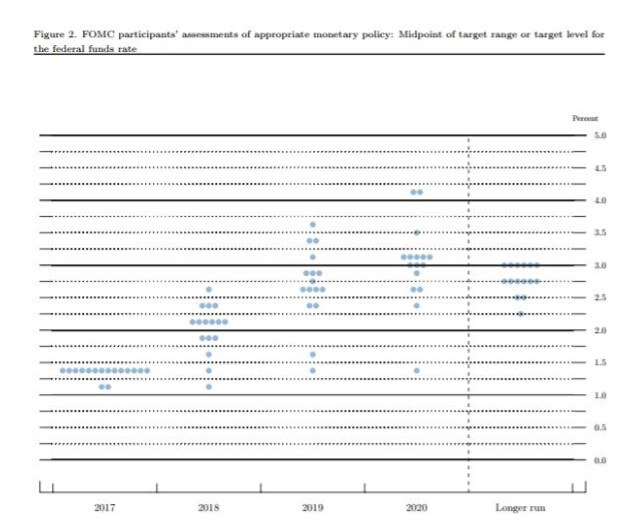 会后公布了体现美联储官员预测未来利率变化的点阵图。它显示,相对多数(六位)美联储官员预期,明年利率为2%-2.5%,这意味着,若每次加息25基点,明年将总共加息三次。
