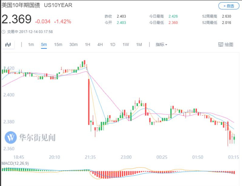 上述数据公布后不到半小时,10年期美债收益率从数据公布前的2.42%上方跌到2.37%下方,美联储决议公布后,收益率半小时内从2.38%左右跌到2.36%左右。