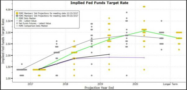 如以上美联储图表所示,此次联储官员预测中位值显示,到2020年末,联邦基金利率将升至3.1%,今年9月预测为2.9%。另外此次仍预计,2020年以后利率为2.8%。