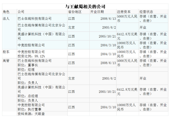 公开资料显示,王献蜀1971年出生,税务专业,中专学历。1993年至2003年9月在税务系统工作的期间,创办了巴士在线项目,并于2003年3月成立巴士在线(南昌)——南昌巴士网络传媒有限公司。2003年筹划成立江西省巴士在线控股有限公司。2003年9月辞职后,于次年成立江西巴士在线传媒有限公司。