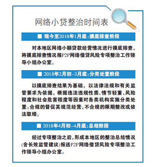 与P2P整治类似,此次针对网络小贷的专项整治也提出进度要求。《通知》要求,对本地区网络小额贷款经营情况首先进行摸底排查,于2018年1月底前将摸底排查情况报P2P网络借贷风险专项整治工作领导小组办公室。之后,依据有关监管要求和法规,在3月底前完成对各类机构实施分类处置工作。合规的督促其规范经营,不合规的限期整改或依法取缔。经过专项整治之后,形成本地区的整治总结情况(含长效监管建议)报送P2P网络借贷风险专项整治工作领导小组办公室,此项工作于4月底前完成。