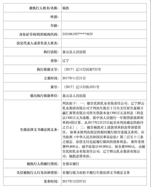 判决信息显示,由杨凯担任法定代表人的被告沈阳乳业有限责任公司、辽宁辉山乳业集团有限公司,应于判决生效后十日内支付原告盘锦万鑫汇商贸有限公司所欠借款本金1300万元及利息,杨凯承担连带清偿责任;同时,承担案件受理费49900元和保全费5000元,由被告沈阳乳业有限责任公司、辽宁辉山乳业集团有限公司、杨凯连带承担。