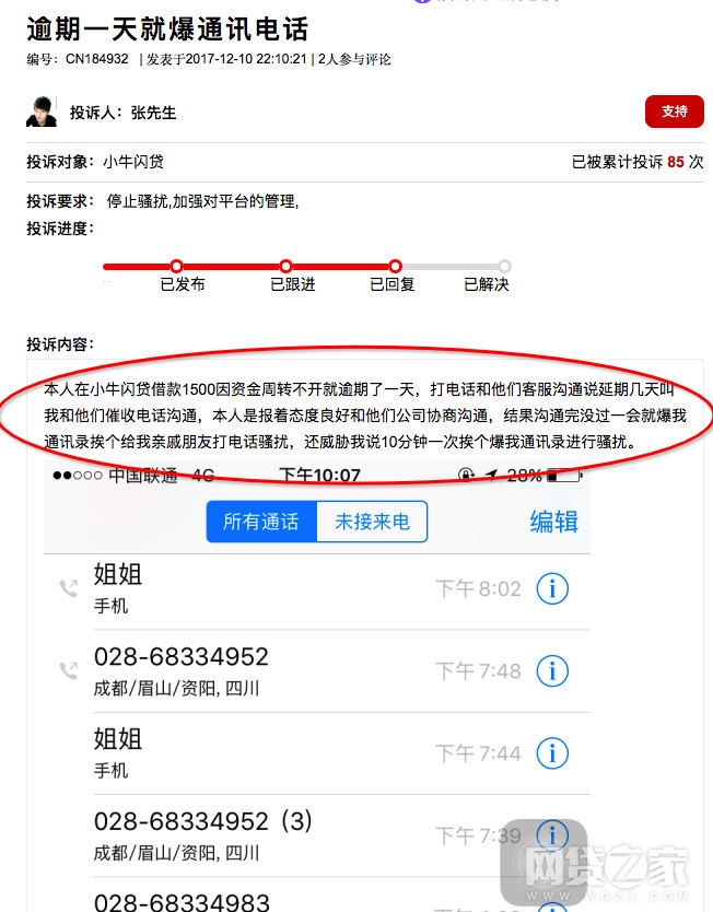 张先生投诉称,其在小牛闪贷借款1500因资金周转不开逾期了一天,打电话与客服沟通希望能延期几天,“本人是报着态度良好和他们公司协商沟通,结果沟通完没过一会就爆我通讯录挨个给我亲戚朋友打电话骚扰,还威胁我说10分钟一次,挨个爆我通讯录进行骚扰。”