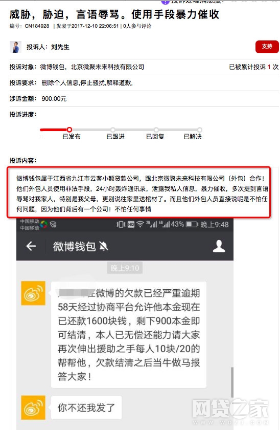 刘先生也表示,其受到了微博钱包的外包催收人员暴力催收,包括24小时轰炸通讯录,泄露私人信息、多次辱骂家人等非法手段。
