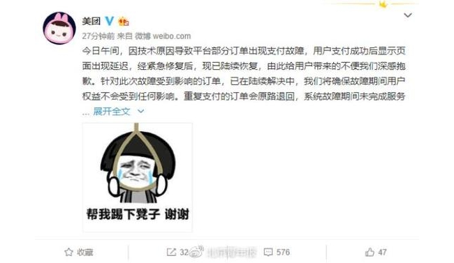 12时43分,美团点评官方微博发布回应:12月7日午间,因技术原因导致平台部分订单出现支付故障,用户支付成功后显示页面出现延迟,经紧急修复后,现已陆续恢复,由此给用户带来的不便我们深感抱歉。针对此次故障受到影响的订单,已在陆续解决中,我们将确保故障期间用户权益不会受到任何影响。重复支付的订单会原路退回,系统故障期间未完成服务的订单,用户可以无责取消退款。