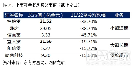 从《通知》出台前后的市场表现来看,具有小额短期现金贷业务的上市企业跌幅较大,11月22日至今(11个交易日),拍拍贷、趣店、信而富的跌幅分比为33.7%、38.74%和45.71%。而从事大额长期信贷业务的上市平台影响稍小,宜人贷与和信贷的跌幅在20%以内。