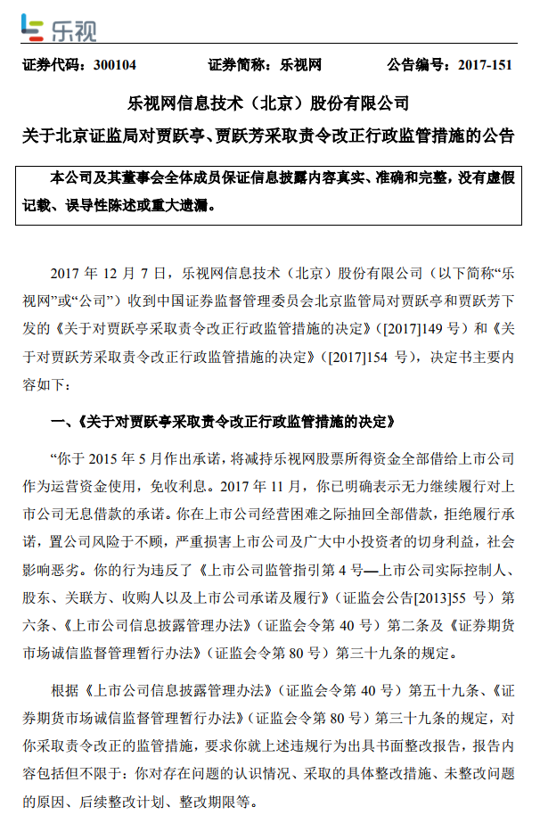 12月7日,乐视网发布公告称,乐视网收到北京证监局对贾跃亭和贾跃芳下发的《关于对贾跃亭采取责令改正行政监管措施的决定》和《关于对贾跃芳采取责令改正行政监管措施的决定》。