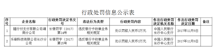 网络整理 2021-03-22 18:4512月6日,中国人民银行长沙中心支行公布行政处罚信息公示表,随行付支付有限公司湖南分公司(下称“随行付”)、乐刷科技有限公司长沙分公司(下称“乐刷科技”)因“违反银行卡收单业务相关规定”,均被处以罚款人民币3万元。作出行政处罚决定日期是2017年11月9日。