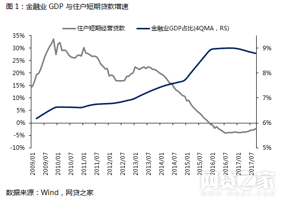 这种至上而下的传导机制导致了小微企业一直面临融资贵、融资难的问题,信贷资源分配上的“救富不救贫”和地域歧视正不断引导整个经济体脱实向虚。经济下行过程中,金融机构风险偏好降低,偏向于向有抵押物大、中型企业投放信贷,或者直接、间接将资本投资于金融同业,导致金融资产和抵押物价值上升,促使更多资金参与到资产泡沫当中形成反馈机制,不断挤压实体经济。从下图可以看出,从2015年起,金融行业占GDP的比重快速上升,而住户短期经营贷款的增速则出现断崖式下跌陷入萎缩。近年来,金融机构沉浸于资产泡沫对小微企业的信贷需求形成挤出效应,经济脱实向虚正在不断自我强化。