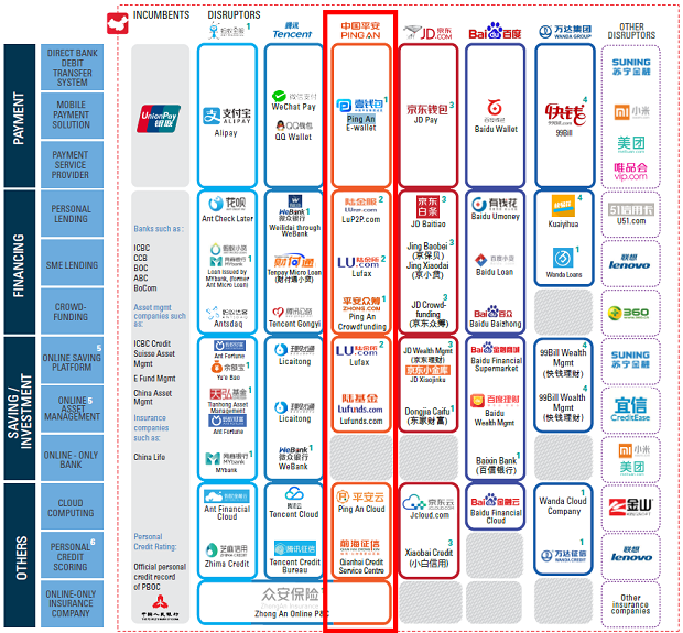截至目前,平安旗下已拥有壹钱包(第三方支付)、陆金所(网络借贷/储蓄)、金融壹账通(中小银行服务支持)、平安众筹(在线众筹)、陆基金(在线资产管理)、前海征信(个人征信)、众安保险(在线专属保险)等多个互联网金融平台。