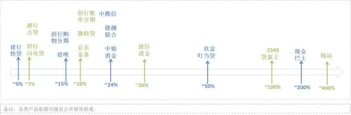 1.不同消费信贷产品的利率水平相差极大。从图一可以看出,利率分布从5%到400%以上,不同产品之间有本质区别。这个区别的背后,实际上是风控能力的区别,进而导致受众人群和利率水平的区别。