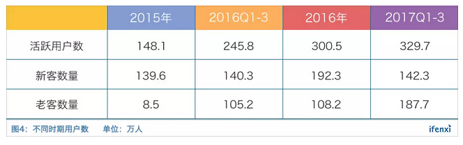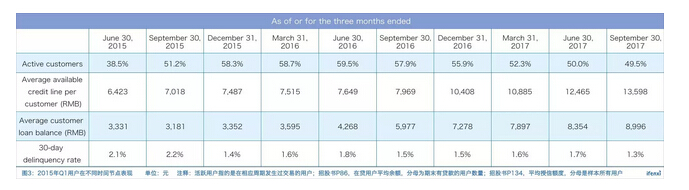 如图我们可以发现,乐信之前两年用户规模处于快速成长期,2017年前三季度新客增长数量与去年同期持平,预期全年新客数量约195万人,综合考虑新客增速和老客流失,全年活跃用户数420万人。