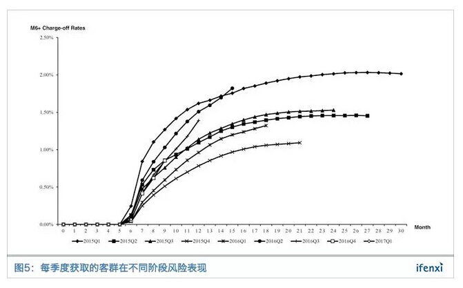 上图则是各季度获取的客群在不同阶段M6+不良率,2016年招商银行信用卡不良贷款率为1.4%,CapitalOne信用卡不良贷款率为2.2%,对比可以发现,乐信客群定位于受高等教育年轻人,与信用卡人群比较一致,客群质量较好。