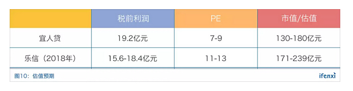 以宜人贷作为对标,宜人贷2017年市值在130-180亿元之间,预测全年税前利润在19.2亿元,同比增长74%,PE在7-9倍之间。乐信2018年税前利润增速达数倍,所以给出11-13倍PE,则2018年估值为171-239亿元。