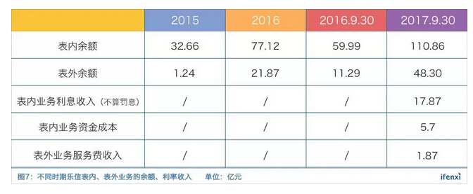 另一部分是撮合业务,乐信将获取的借款人输送到第三方金融机构,收取一定的撮合服务费并承担信用风险。目前乐信与30余家金融机构达成合作,其中不乏工商银行这种巨无霸。由于是撮合服务,所以这部分业务被计入表外,三季度末余额为48.3亿元。