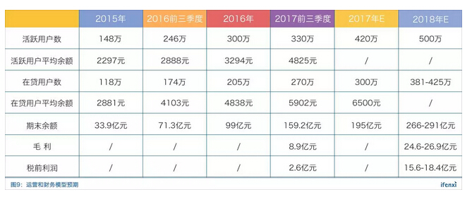 2017年前三季度在贷用户270万人,年化25%的用户流失率,年底会有约250万用户留存。所以假设2017年底在贷用户中有50万当季新增用客,250万老用户,参考图3样本人群表现,新用户为3000元平均在贷余额,老用户为7200元平均在贷余额,则贷款余额为195亿元。