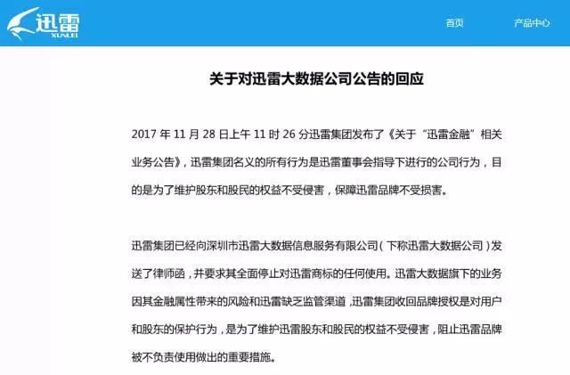 迅雷表示,如迅雷大数据公司及其子公司从事的“迅雷金融”、“迅雷易贷”、“迅雷小游戏”及“迅雷爱交易”等相关业务违反国家法律法规和相关政策,对迅雷商标和品牌造成任何影响和损害,迅雷均保留法律追诉的权利。
