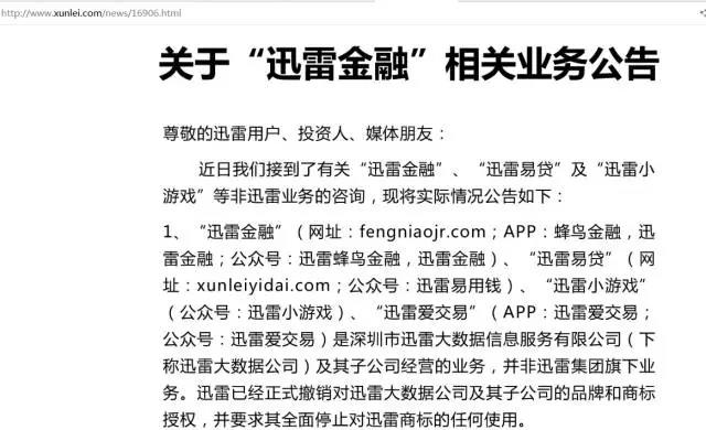 网络整理 2021-03-22 18:5511月28日,深圳市迅雷网络技术有限公司(下称“迅雷”)在其官网发布《关于“迅雷金融”相关业务公告》(下称“公告”)称,“迅雷金融”、“迅雷易贷”、“迅雷小游戏”、“迅雷爱交易”是深圳市迅雷大数据信息服务有限公司(下称“迅雷大数据公司”)及其子公司经营的业务,并非迅雷集团旗下业务。