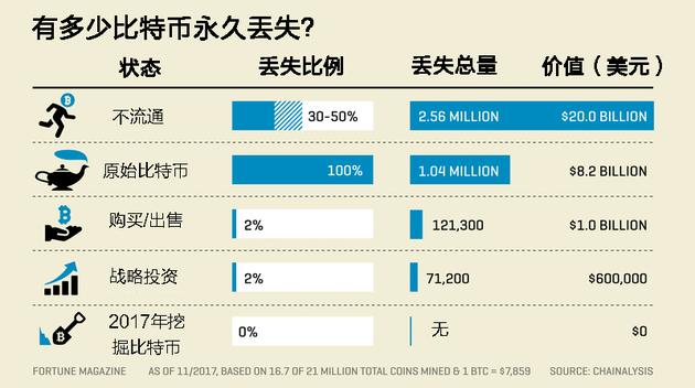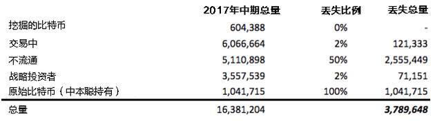 “挖掘的比特币”反映了2017年挖掘的比特币总数(他们假设这些比特币没有丢失),而“交易”指的是过去一年转移或花掉的比特币——其中丢失的数量很少。类似地,“战略投资者”一类指的是已经持有比特币一两年时间的人,他们丢失的比特币占比也很小。