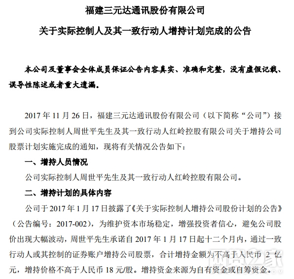 同时,三元达还发布公告,称收到周世平及其一致行动人红岭控股有限公司(下文简称红岭控股)关于增持公司股票计划实施完成的通知。此前,周世平承诺自2017年1月17日起十二个月内,通过一致行动人或其控制的证券账户增持公司股票,合计增持金额为不高于人民币2亿元。