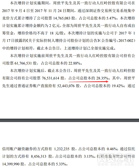 公告称,上市增持计划实施期间,周世平及其一致行动人红岭控股在2017年9月4日至2017年11月24日期间,通过深圳证券交易所交易系统集中竞价方式累计增持了公司股票14,765,083股,占公司总股本的5.47%,本次增持计划实施累计增持金额约为2亿元,全部为周世平先生及其一致行动人自有或自筹资金,增持价格均不高于18元/股。