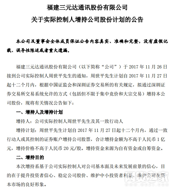网络整理 2021-03-22 18:55网贷之家讯 11月27日,A股上市公司三元达(002417.SZ)发布公告,称公司实际控制人周世平(P2P平台红岭创投董事长,即“红岭老周”)及及其一致行动人计划自2017年11月27日起十二个月内,合计增持三元达股票不高于人民币1亿元,增持价格不高于人民币20元/股,增持资金来源为自有资金或自筹资金。