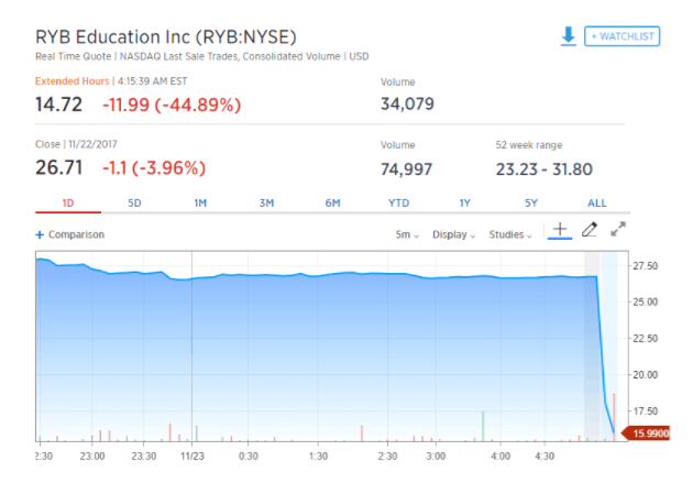 但这并没有阻止感恩节休市翌日红黄蓝美股价格的大幅走跌。截止目前,纽交所挂牌交易的红黄蓝教育盘前跌幅已扩大逾40%,资本市场对事件的持续发酵做出了回应。
