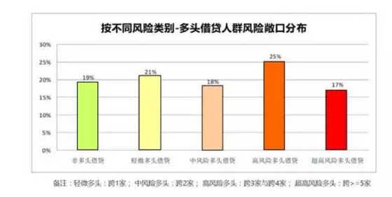 据多头借贷人群风险敞口分布显示:轻微多头(跨1家平台)占比21%;中风险多头(跨2家平台)占比18%;高风险多头(跨3至4家平台)占比25%;超高风险多头(跨5家平台以上)占比17%。