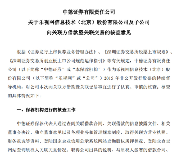 “本保荐机构同意公司后续按照公告披露的程序履行本次关联借款的审计、评估及股东会审议流程,并在本次借款办理前解除乐视投资与沃宸的股权质押及乐视云与钰祥的股权质押,”中德证券在核查意见中如此表示。