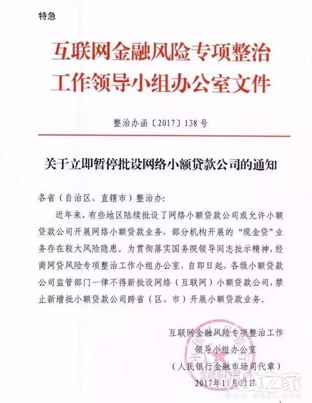 11月21日,互联网金融风险专项整治工作领导小组办公室向各省(自治区、直辖市)整治办下发特急文件《关于立即暂停批设网络小额贷款公司的通知》(下称《通知》),要求各级小贷公司监管部门即日起一律不得新批设网络(互联网)小额贷款公司,禁止小贷公司跨区域经营。