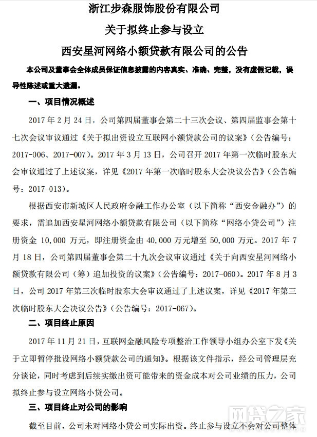 网络整理 2021-03-22 18:59网贷之家讯 11月22日,浙江步森服饰股份有限公司(下简称“步森股份”)发布《关于拟终止参与设立西安星河网络小额贷款有限公司的公告》(下简称“公告”)。公告指出2017 年 11 月 21 日,互联网金融风险专项整治工作领导小组办公室下发《关于立即暂停批设网络小额贷款公司的通知》。根据该文件指示,经公司管理层充分谈论,同时考虑到后续实缴出资可能带来的资金成本对公司业绩的压力,公司拟终止参与设立网络小贷公司。