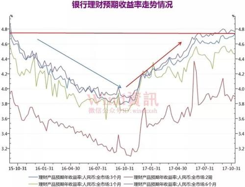 Wind资讯综合统计,截至目前,银行理财2周、1个月、3个月、6个月的预期收益率分别达3.89%、4.46%、4.74%、4.76%。分别较年初上涨18BP、22BP、54BP、56BP。其中3个月期收益率更是创2015年10月初以来新高,而6个月期品种早在10月份亦达4.80%,同样创2015年10月初以来新高,目前仍在4.75%左右徘徊。