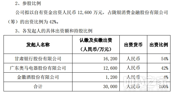 公告称,奥马电器将以自有资金出资1.26亿美元,占陇银消费金融股份有限公司(筹)的出资比例为42%,甘肃银行将出资1.62亿元(出资占比54%),金徽酒将出资0.12亿元(出资占比4%)。