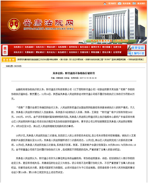 11月14日,岚皋县人民法院依法对财付通公司拒不履行协助执行义务的行为罚款40万元。