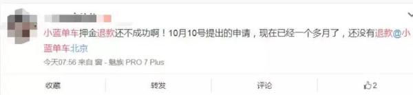 其实自9月底开始,小蓝单车就不断被曝出有逾期未退还押金的现象,有用户表示,退款申请已近40天仍未到账。