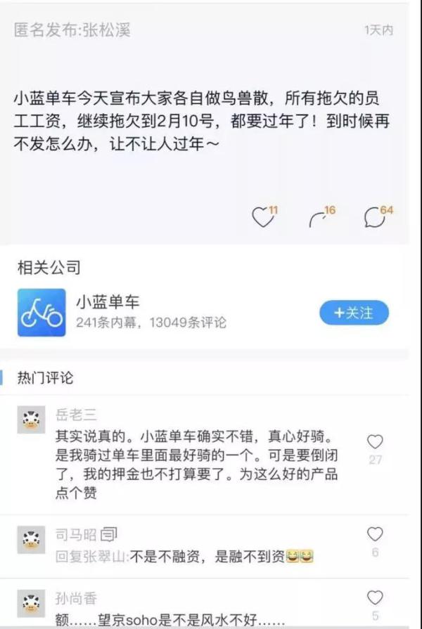 疑似小蓝单车员工在某匿名职场社交平台发布小蓝单车解散消息