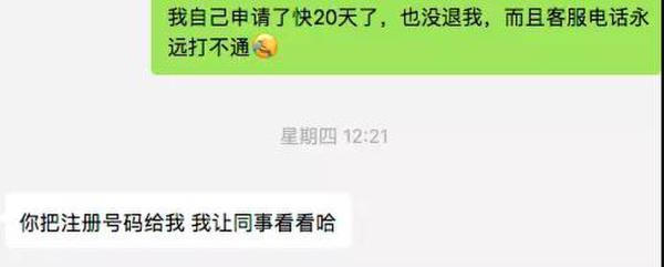 对此,有媒体在申请退款20天未果,多次拨打客服热线无法接通,多次添加官方退款微信号未通过的情况下,直接和小蓝单车内部员工进行沟通并亮明身份,对方索要了注册账号,押金在几分钟便退还到账了。
