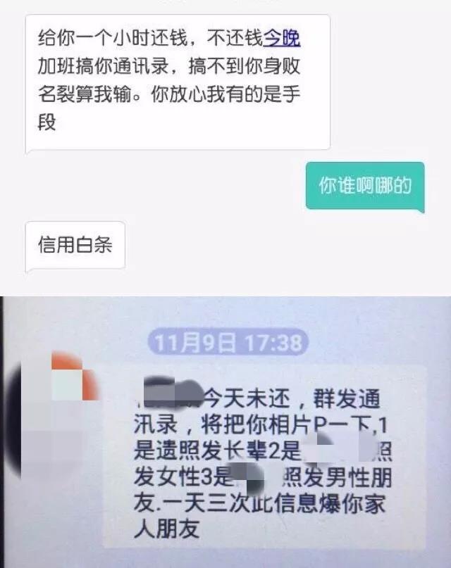 很快,过了最后的还款日期,他的个人信息被交到了专业催收公司手里,通讯录“爆”了,所有的亲人,包括半年来联系过的同学和朋友,全部收到了他欠钱的信息。