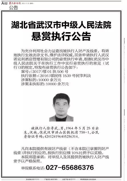 昨天,楚天都市报整版发布一则武汉市中级人民法院悬赏执行公告: